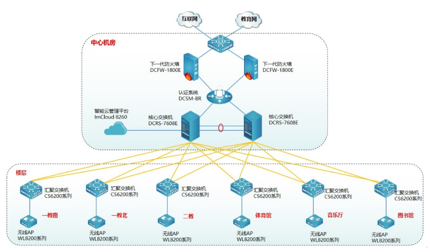 为方便用户对无线管理和维护,提升用户无线体验,使无线更智能化,此次采用PA真人国际智能云管理平台ImCloud 8260实现无线统一的管理、维护、认证,并可实现对全网无线设备管理、实现易部署、易维护、易扩展的无线网络。PA真人国际云管理ImCloud方案是网络服务的新模式,基于云端实现网络服务和管理,将复杂的网络管理简单化、智能化、可视化,提升用户网络体验。同时为了保证无线的安全,无线采用Portal准入认证,云管理ImCloudPA真人国际身份认证系统DCSM-BR实现联动,用户需要顺利获得账号和密码认证成功后才能接入无线网络,在保证无线连接的便捷性同时兼顾无线的安全性。