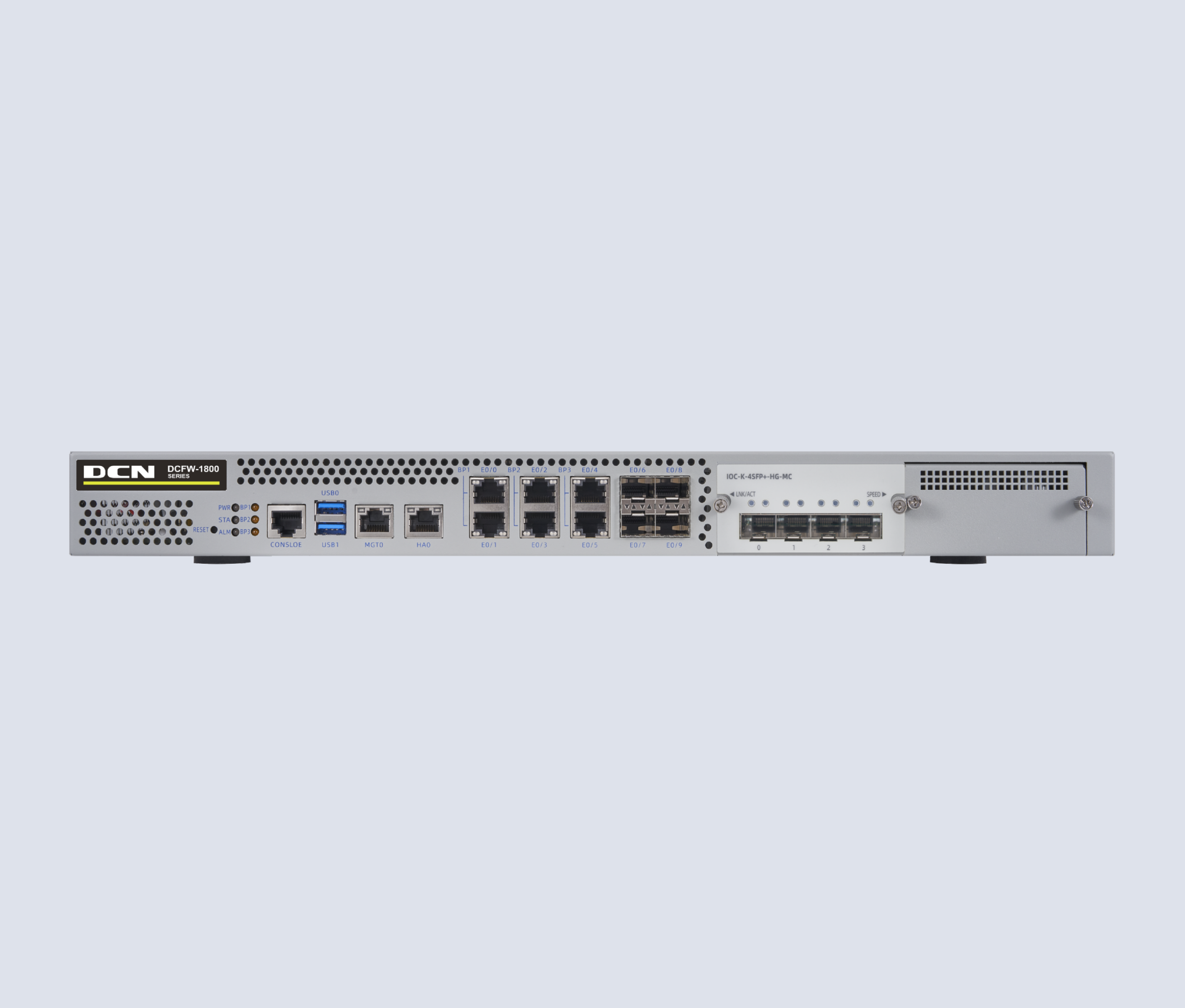 DCFW-1800-N5880-G 软硬件平台基本系统,含硬件保修、应用识别库升级和软件升级维护服务。硬件参数:1U,1 个CON 口,1 个MGT口,1个HA口,2个USB口,8个千兆电+8个万兆光口,2个通用扩展槽。